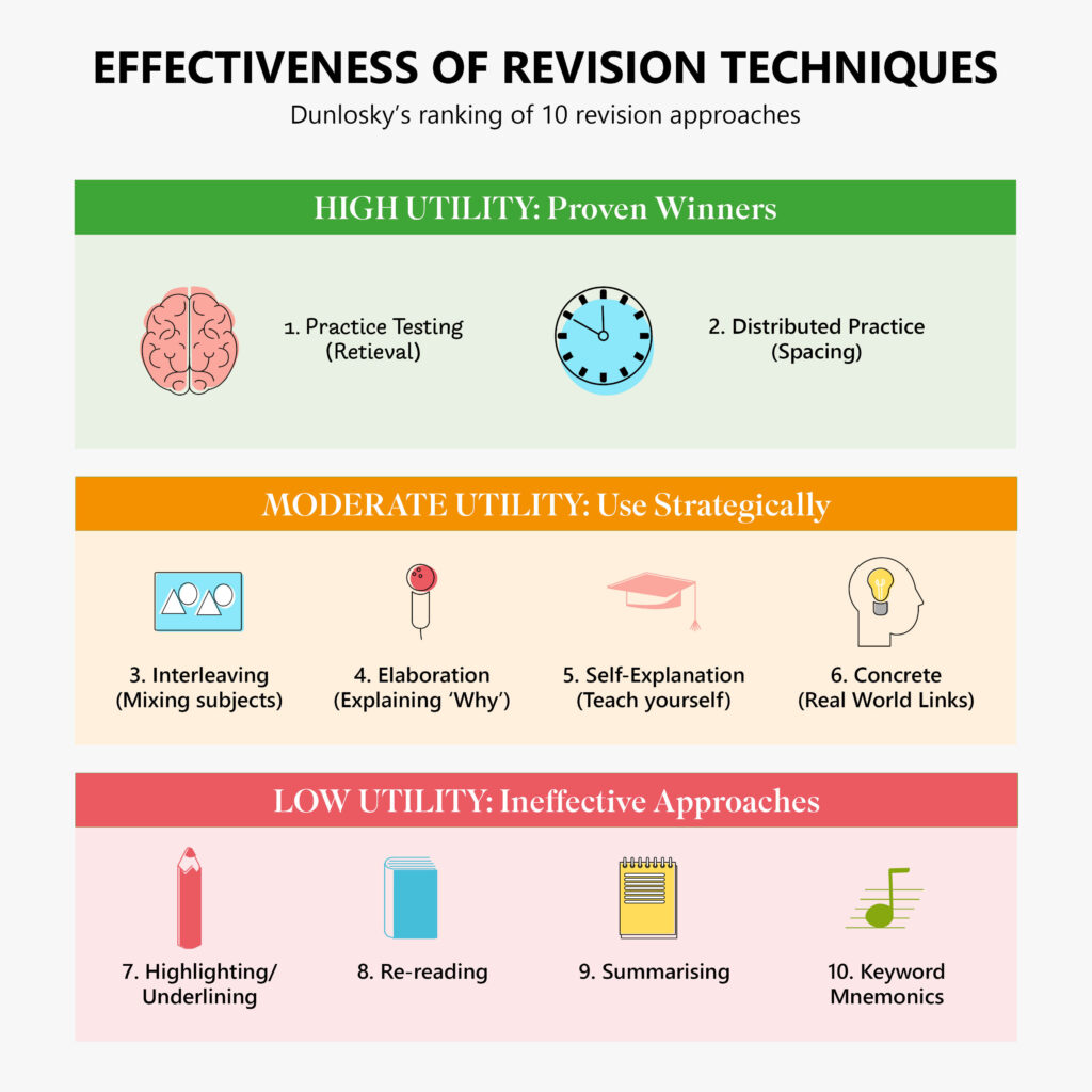 Dunlosky and his team reviewed 10 common revision techniques and ranked them by “Utility” (how much “bang for your buck” you get). The results are often surprising because the techniques students love most (like highlighting) are often the least effective.
