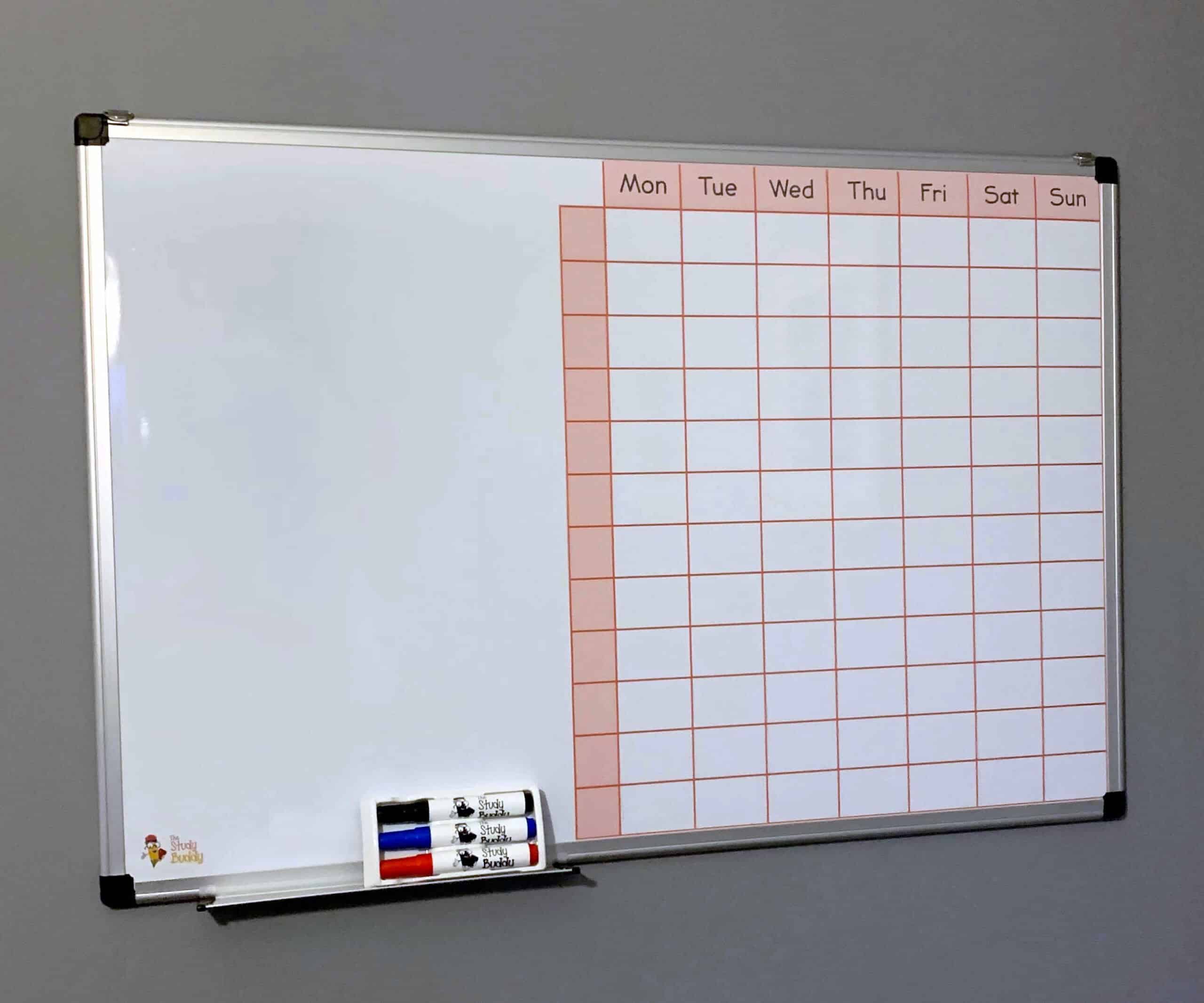 Our magnetic whiteboard is specifically designed for our units. The week-to-view plan leaves plenty of room for the backlog of work to be on display. The beauty of this being a physical approach is that everyone can see at a glance what the plan is. The dry-wipe is important for flexibly factoring in other commitments.