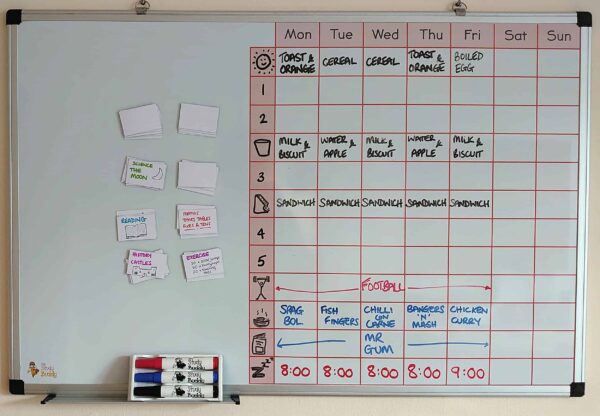Kids absolutely love to get involved. Create repeatable tasks with the blank magnets to suit their favoured activities – iPads, Lego, Netflix – alongside the ones that they need to be doing – reading, creative projects, maths, spellings and so on. There’s no limit to what you can organise, create a bank of meals for dinners, and household chores for them to get involved in.