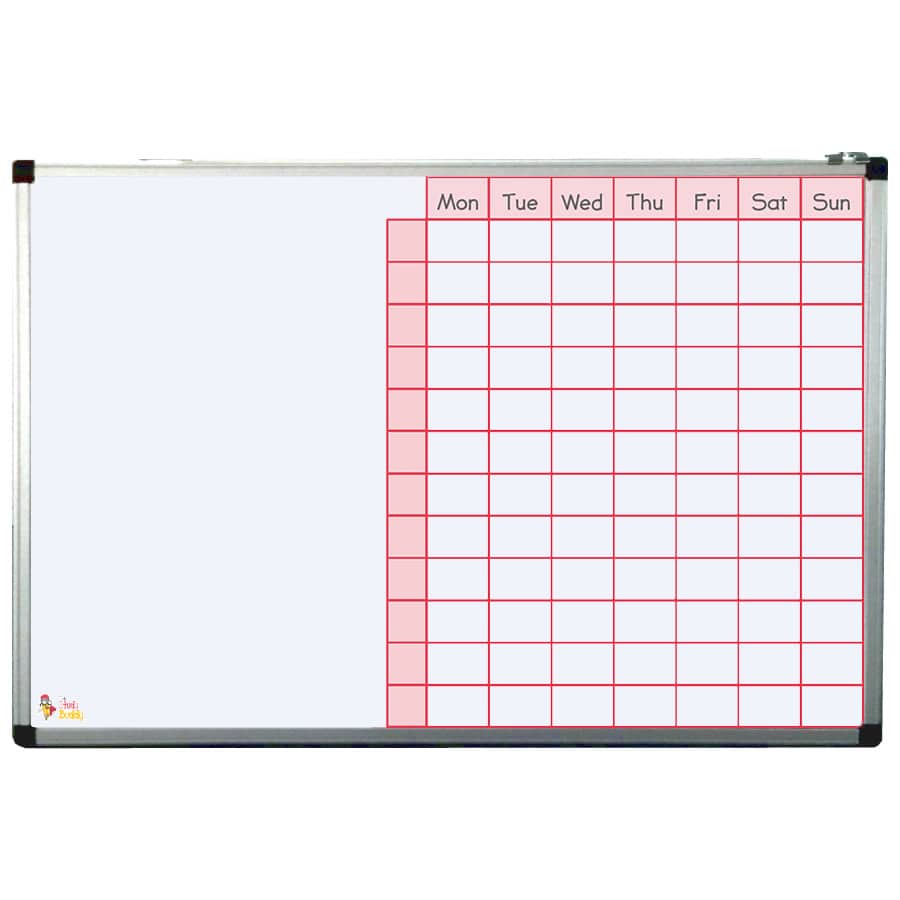 The Buddy board is a 90cm x 60 magnetic dry wipe whiteboard. with an unfussy aluminum frame. The week grid is already printed on to it. It’s nice and light at only 1.5kgs. It contains your fixings.