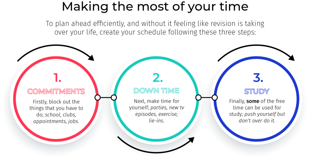 How to do it: Draw a weekly grid. Block out commitments, like school, and then downtime. The gaps that are left are potential revision sessions.